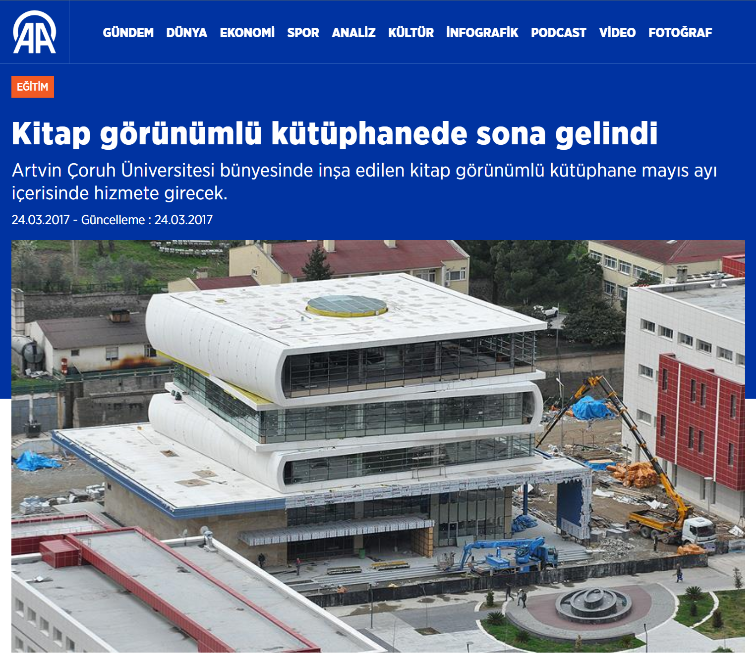 Kitap görünümlü kütüphanede sona gelindi! Artvin Çoruh Üniversitesi bünyesinde inşa edilen kitap görünümlü kütüphane, mayıs ayı içerisinde hizmete girecek. Üniversitenin şehir yerleşkesinde yükselen bu eşsiz yapı, görenlerin ilgisini çekmeye devam ediyor. Masa üzerindeki simetrik üç kitap görünümüne sahip olan kütüphanenin girişinde ise dağınık kalem figürleri yer alıyor.