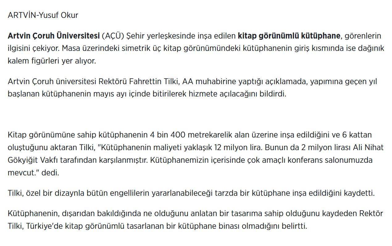 Artvin Çoruh Üniversitesi Rektörü Fahrettin Tilki, AA muhabirine yaptığı açıklamada, yapımına geçen yıl başlanan kütüphanenin mayıs ayı içerisinde tamamlanarak hizmete açılacağını belirtti.