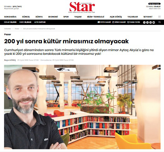 Osmanlı ve Selçuklu mimarilerinin kendine özgü kimlikleri varken, günümüz Türk mimarisinin özgün bir karakteri olup olmadığı tartışmalı bir konu. Cumhuriyet sonrası mimari hakkında konuşan Akyüz, “Ülkemizde Cumhuriyet mimarisi oluşturmak gibi bir kaygı hiçbir zaman olmadı.” diyerek, günümüz mimarisinin kimliksizleştiğini vurguluyor.